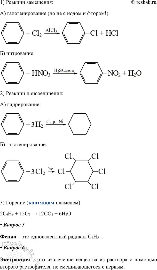 1) Реакции замещения как у алканов; идут с бензолом с замещением атома водорода в бензольном кольце другим атомом или группой атомов
