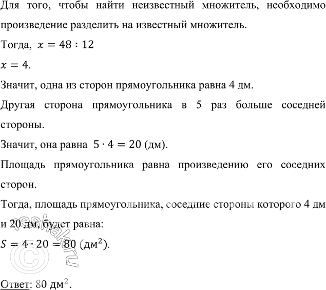 Тогда, вторая сторона прямоугольника 5xдм, так как другая сторона прямоугольника в 5 раз больше соседней стороны.