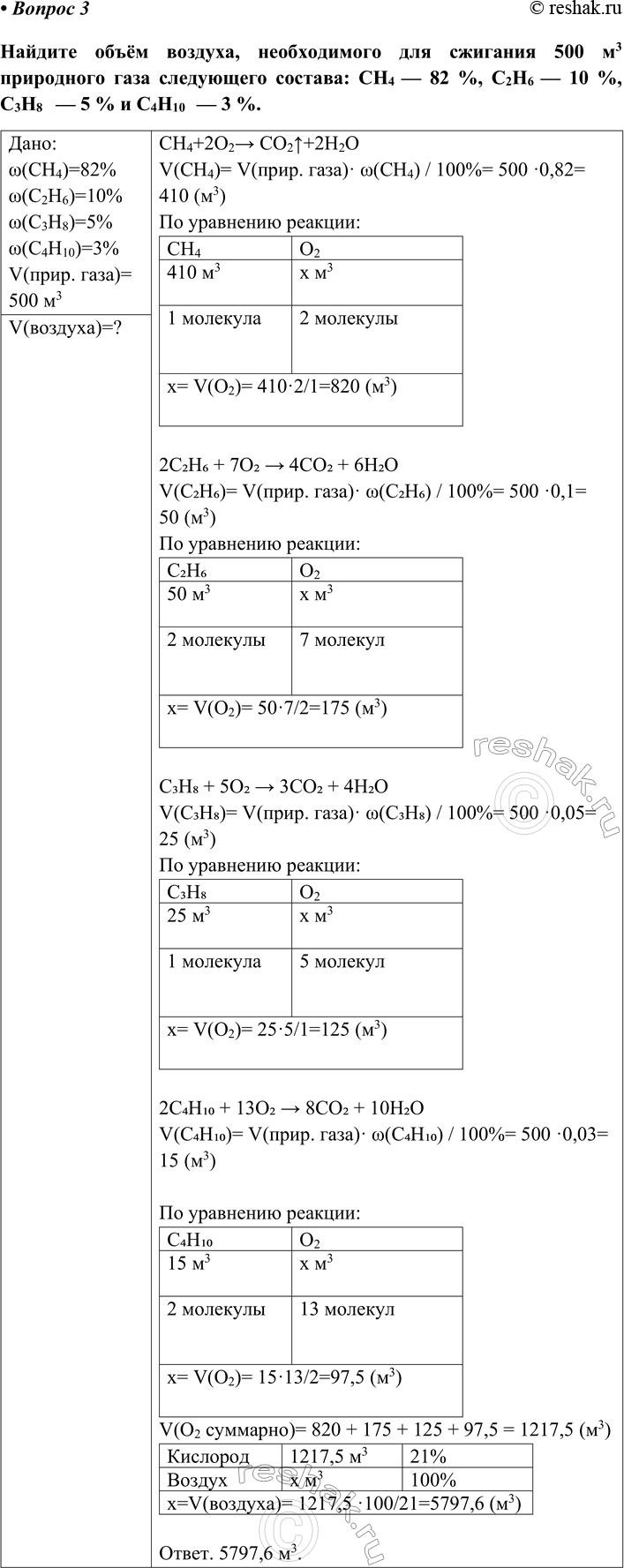 Найдите объём воздуха, необходимого для сжигания 500 м3 природного газа следующего состава: CH4 — 82 %, C2H6 — 10 %, C3H8 — 5 % и C4H10 — 3 %.