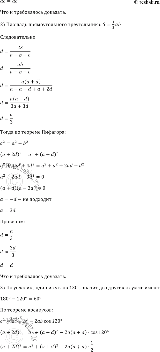 2) длины сторон прямоугольного треугольника образуют арифметическую прогрессию, то её разность равна радиусу вписанной окружности этого треугольника;