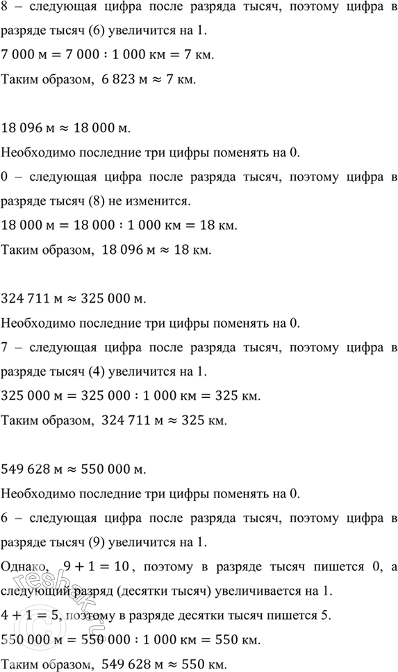 Запишите в километрах, предварительно округлив до тысяч метров: 1 469 м; 5 424 м; 6 823 м; 18 096 м; 324 711 м; 549 628 м.