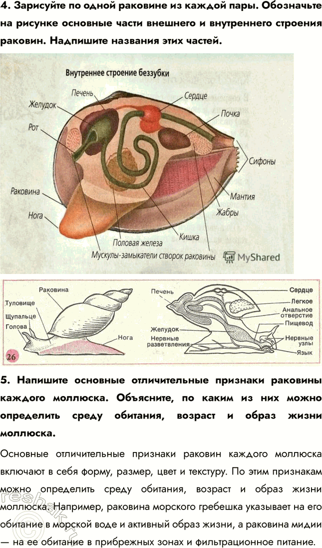 5. Напишите основные отличительные признаки раковины каждого моллюска. Объясните, по каким из них можно определить среду обитания, возраст и образ жизни моллюска.