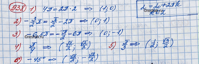 938. Найти координаты точки единичной окружности, полученной поворотом точки (1; 0) на угол: