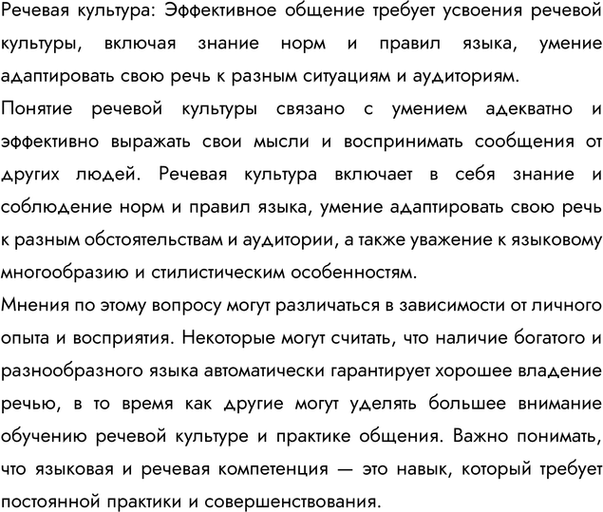 Речевая культура: Эффективное общение требует усвоения речевой культуры, включая знание норм и правил языка, умение адаптировать свою речь к разным ситуациям и аудиториям.