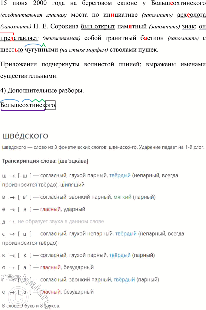 (4) 15 июня 2000 года на береговом склоне у Большеохтинского2 (сложное прил. с соединит. гласной е) моста по инициативе5 (словарное слово) археолога (словарное слово) П. Е. Сорокина был открыт памятный (словарное слово) знак: он представляет (словарное слово) собой гранитный (словарное слово) бастион (словарное слово) с шестью (разделит. ь) чугунными (нн на стыке корня и суффикса) стволами пушек.