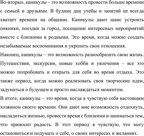 Кроме того, каникулы дают возможность путешествовать и исследовать новые места. Поездки в другие города или страны расширяют мой кругозор, позволяют познакомиться с разными культурами и традициями, а также ощутить атмосферу других мест.