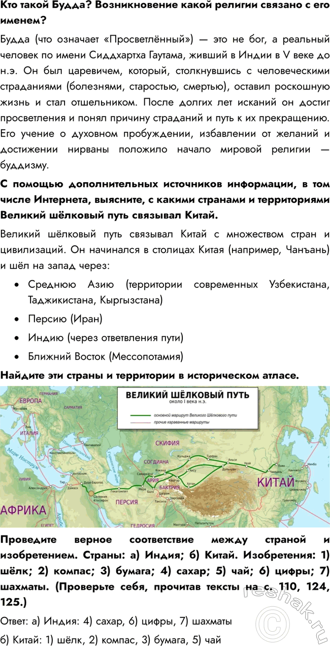 Проведите верное соответствие между страной и изобретением. Страны: а) Индия; б) Китай. Изобретения: 1) шёлк; 2) компас; 3) бумага; 4) сахар; 5) чай; 6) цифры; 7) шахматы. (Проверьте себя, прочитав тексты на c. 110, 124, 125.)