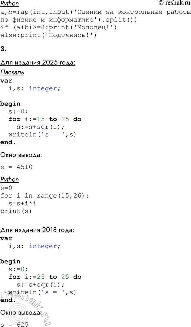 2. Составьте программу, запрашивающую оценки за контрольные работы по информатике и физике. Если их сумма не менее 8, то должен выводиться комментарий «Молодец!», в противном случае — «Подтянись!».