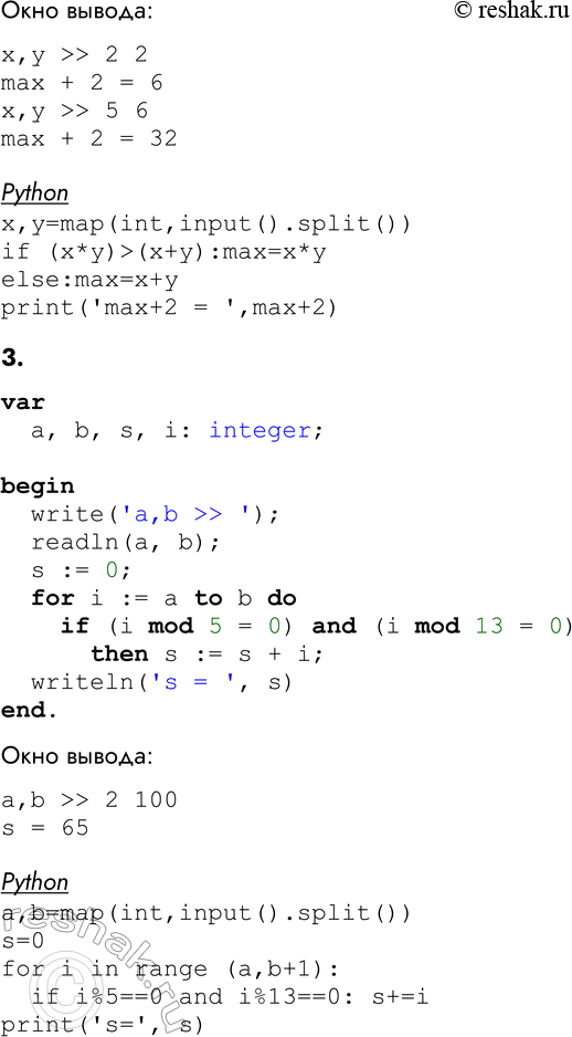 3. Составьте программу нахождения суммы всех натуральных чисел из диапазона от А до В, включая А и В, кратных 5 и 13 (А и В вводятся с клавиатуры).