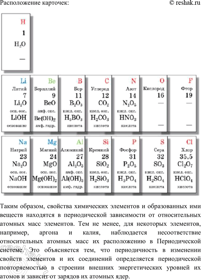 Перемешайте карточки, а затем расположите их в ряд по возрастанию относительных атомных масс элементов. Сходные элементы с 1-го по 18-й расположите друг под другом: водород над литием и калий под натрием, соответственно кальций под магнием, гелий под неоном. Сформулируйте выявленную вами закономерность в виде закона. Обратите внимание на несоответствие относительных атомных масс аргона и калия их расположению по общности свойств элементов. Объясните причину этого явления.