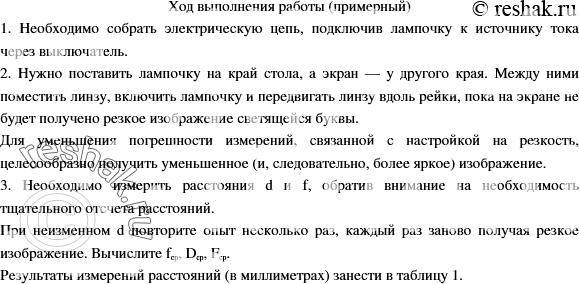 2. Поставьте лампочку на один край стола, а экран-на другой край. Между ними поместите линзу, включите лампочку и передвигайте линзу вдоль рейки, пока на экране тне будет получено резкое изображение светящейся буквы.Для уменьшения погрешности измерений, связанной с настройкой на резкость, целесобразно получить уменьшенное (и, следовательно, более яркое) изображение.