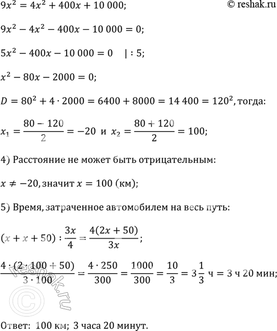 Из пункта A в пункт B выехал автобус, и одновременно с ним из В в А выехал автомобиль. Они встретились в пункте С, причём расстояние, пройденное автомобилем до места встречи,оказалось на 50 км больше пройденного автобусом. Автобус прибыл в конечный пункт через 3 ч после встречи, а автомобиль — через 1 ч 20 мин. На каком расстоянии от пункта А произошла встреча? За какое время автомобиль прошёл всё расстояние?