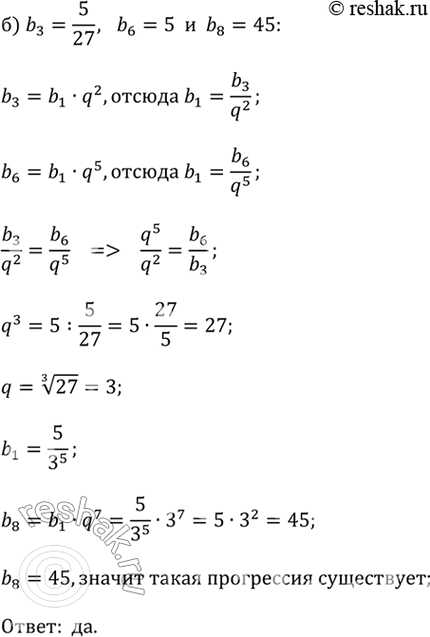 б) Существует ли геометрическая прогрессия, в которой b_3 = 5/27, b_6 = 5 и b_8 = 45?