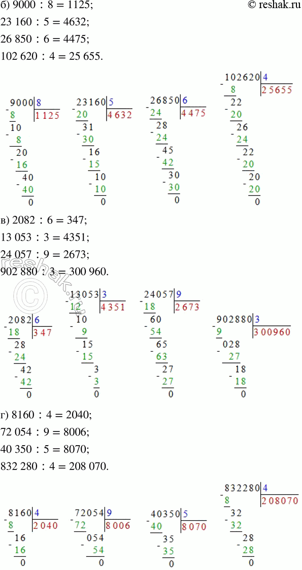а) 7508 : 4 б) 9000 : 8 в) 2082 : 6 г) 8160 : 4