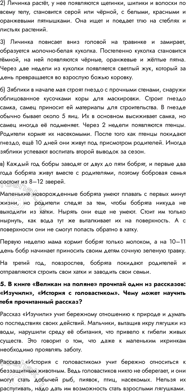 4. С помощью книги «Зелёные страницы» подготовь сообщение на одну из тем: а) как развивается божья коровка; б) как выводят потомство зяблики; в) как бобры заботятся о своих детёнышах.