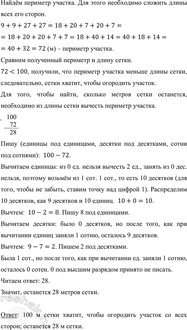 Ответ: 100 м сетки хватит, чтобы огородить участок со всех сторон; останется 28 м сетки.