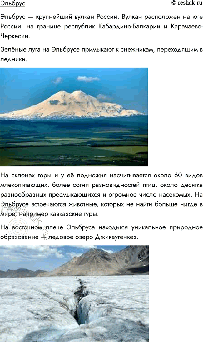 Эльбрус — крупнейший вулкан России. Вулкан расположен на юге России, на границе республик Кабардино-Балкарии и Карачаево-Черкесии.