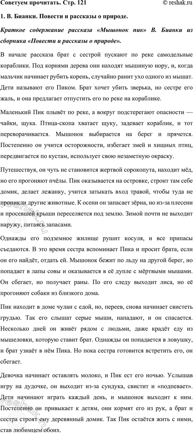 Краткое содержание рассказа «Мышонок пик» В. Бианки из сборника «Повести и рассказы о природе».