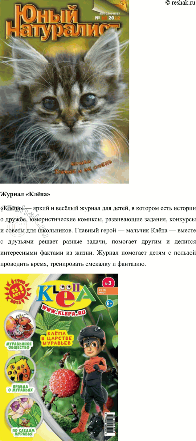 1. Надеюсь, что у каждого из вас есть любимый журнал. Как он называется? О чём он: о весёлых приключениях мальчиков и девочек, о животных и природе или ещё о чём-нибудь?