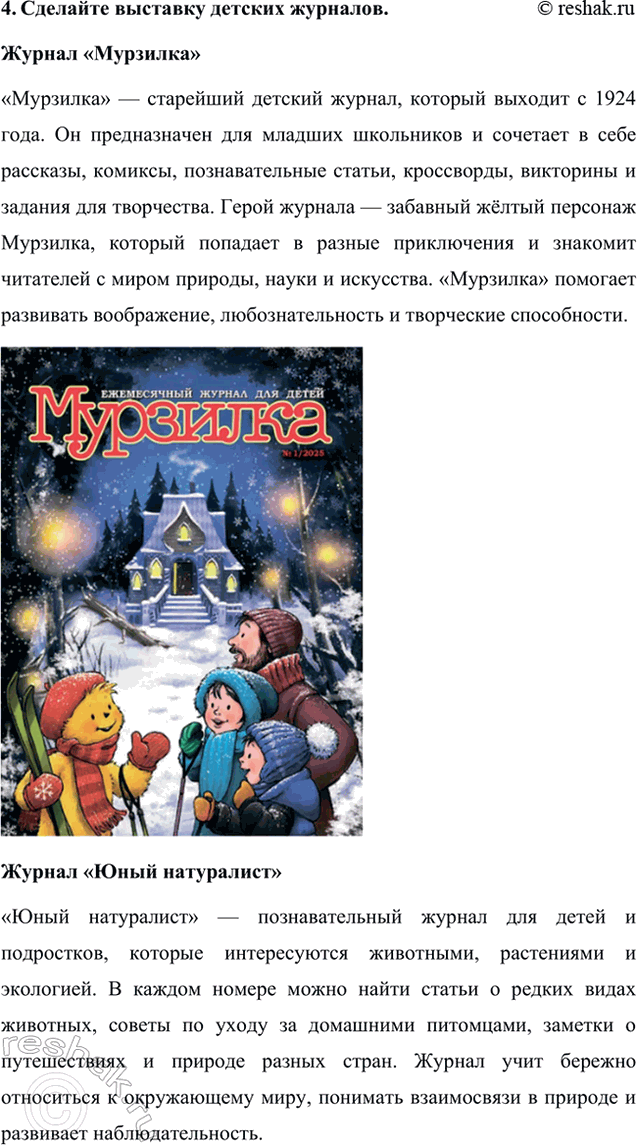 Мой любимый журнал — «Мурзилка». Он для младших школьников. В нём есть рассказы и комиксы про приключения детей и Мурзилки, познавательные статьи о животных и природе, задания на внимание и логику, «мастерилки» (поделки и эксперименты), кроссворды, викторины, страничка про безопасность и иногда мини-уроки английского. Выходит раз в месяц.