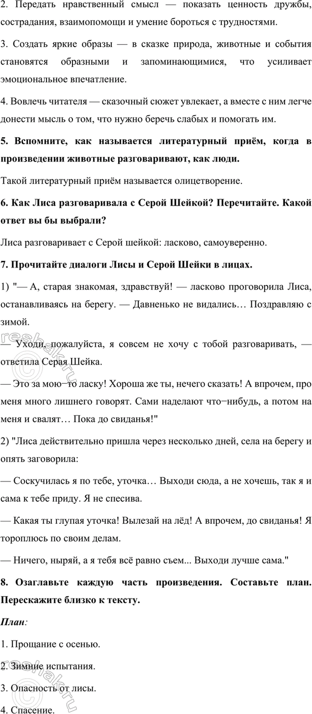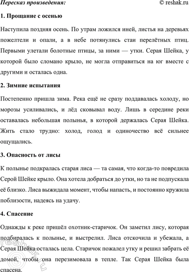 2. Расскажите о Серой Шейке. Когда вам было особенно её жалко? Найдите в тексте этот эпизод. Выделите в нём опорные слова и перескажите.