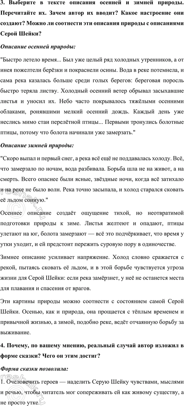 3. Выберите в тексте описания осенней и зимней природы. Перечитайте их. Зачем автор их вводит? Какое настроение они создают? Можно ли соотнести эти описания природы с описаниями Серой Шейки?