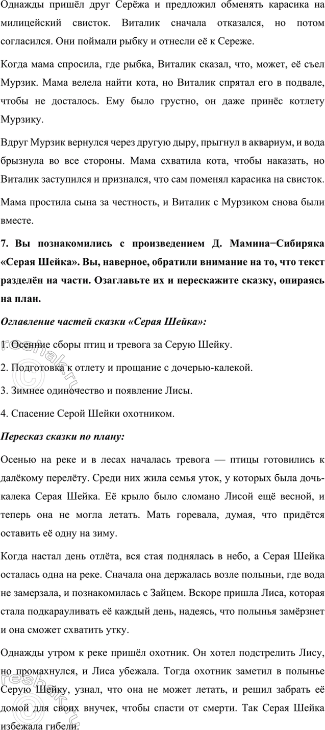 7. Вы познакомились с произведением Д. Мамина-Сибиряка «Серая Шейка». Вы, наверное, обратили внимание на то, что текст разделён на части. Озаглавьте их и перескажите сказку, опираясь на план.