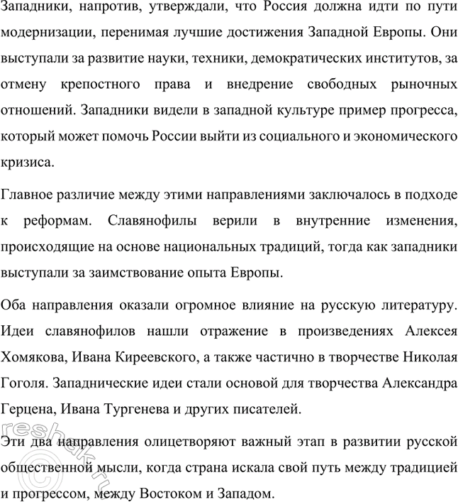 В 1840-х годах в русской общественной и культурной жизни развернулась борьба между двумя идеологическими направлениями – западниками и славянофилами. Западники считали, что Россия должна развиваться по пути Европы, перенимая достижения западной культуры, такие как демократические институты, свобода личности, равенство. Они утверждали, что только модернизация и отказ от крепостного права смогут вывести страну из отсталости.
