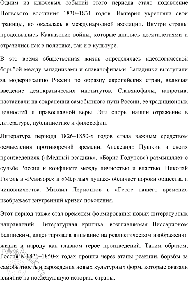 Этот период также стал временем формирования новых литературных направлений. Литературная критика, возглавляемая Виссарионом Белинским, акцентировала внимание на реалистическом изображении жизни и народу как главном герое произведений. Таким образом, Россия в 1826–1850-х годах прошла через этапы реакции, борьбы за самобытность и зарождения новых культурных форм, которые оказали влияние на последующую историю страны.