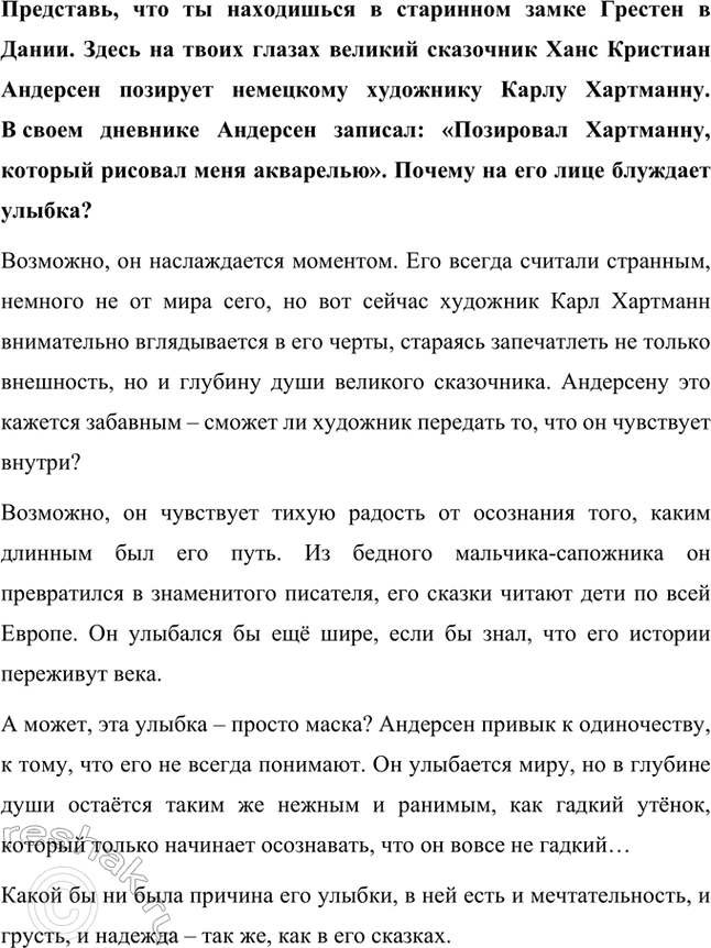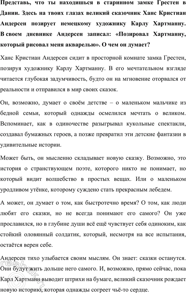 Представь, что ты находишься в старинном замке Грестен в Дании. Здесь на твоих глазах великий сказочник Ханс Кристиан Андерсен позирует немецкому художнику Карлу Хартманну. В своем дневнике Андерсен записал: «Позировал Хартманну, который рисовал меня акварелью». О чем он думает?