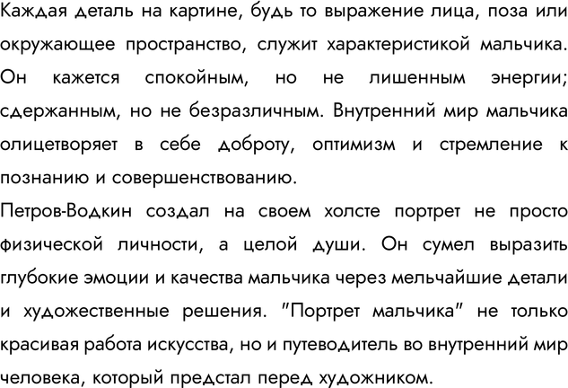 Петров-Водкин создал на своем холсте портрет не просто физической личности, а целой души. Он сумел выразить глубокие эмоции и качества мальчика через мельчайшие детали и художественные решения. "Портрет мальчика" не только красивая работа искусства, но и путеводитель во внутренний мир человека, который предстал перед художником.