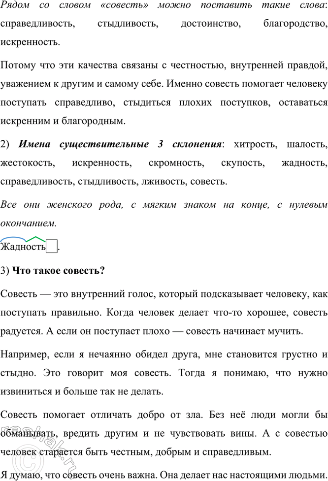 Совесть помогает нам различать между хорошим и плохим. Например, если ты взял чужую книгу без разрешения, совесть скажет тебе, что это нехорошо, и ты должен вернуть книгу и извиниться. Таким образом, совесть помогает нам быть честными и добрыми.