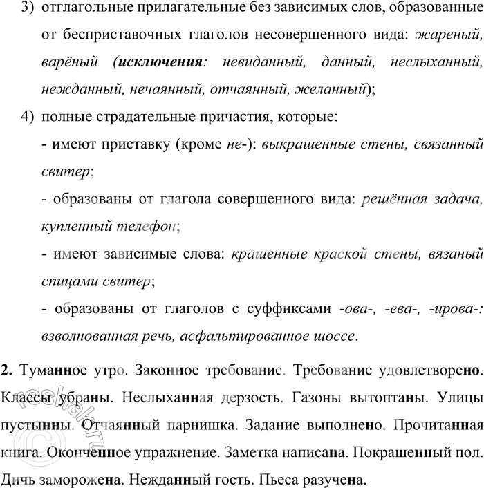 Туманное утро. Законное требование. Требование удовлетворено. Классы убраны. Неслыханная дерзость. Газоны вытоптаны. Улицы пустынны. Отчаянный парнишка. Задание выполнено. Прочитанная книга. Оконченное упражнение. Заметка написана. Покрашенный пол. Дичь заморожена. Нежданный гость. Пьеса разучена.
