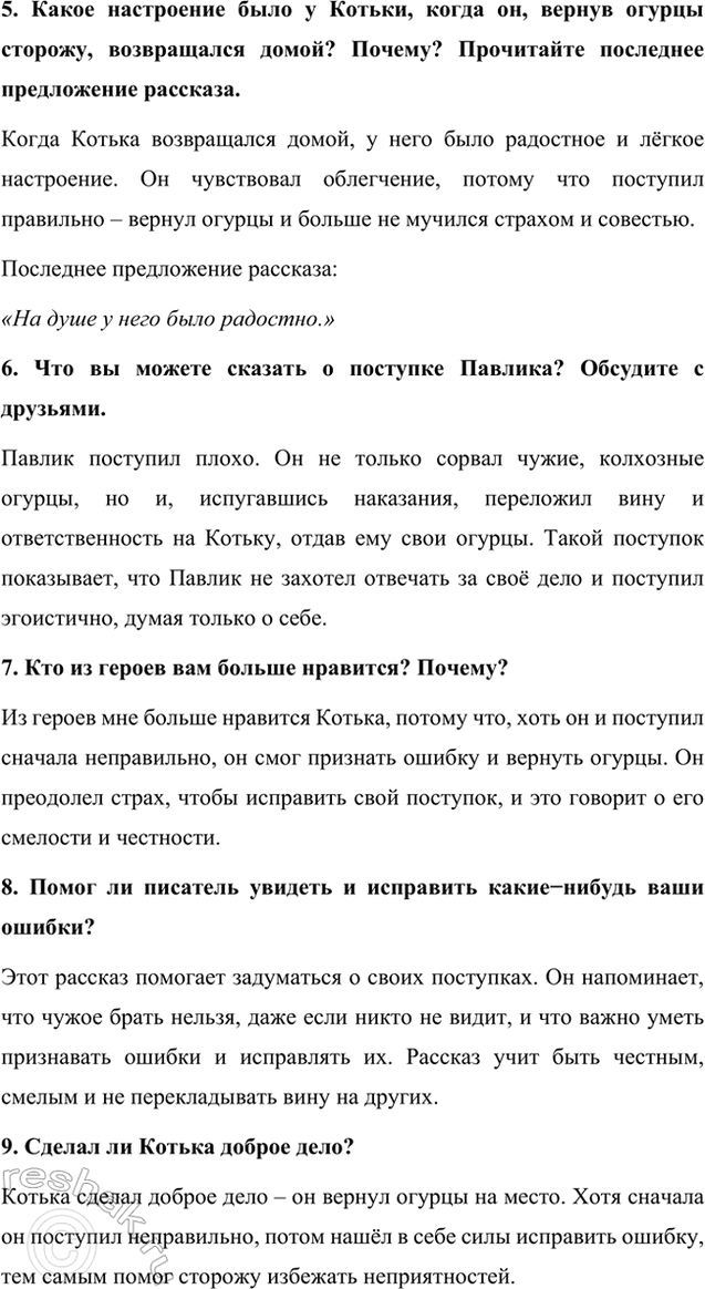 5. Какое настроение было у Котьки, когда он, вернув огурцы сторожу, возвращался домой? Почему? Прочитайте последнее предложение рассказа.