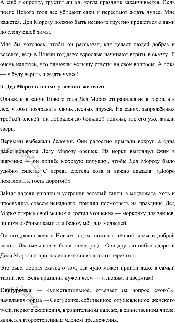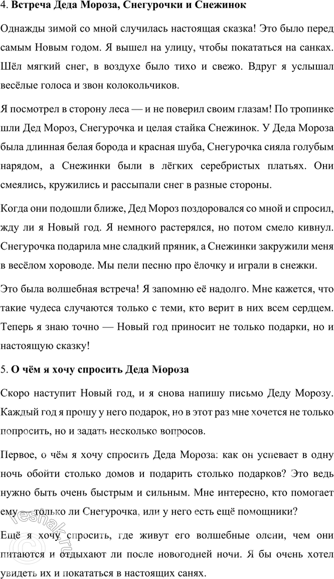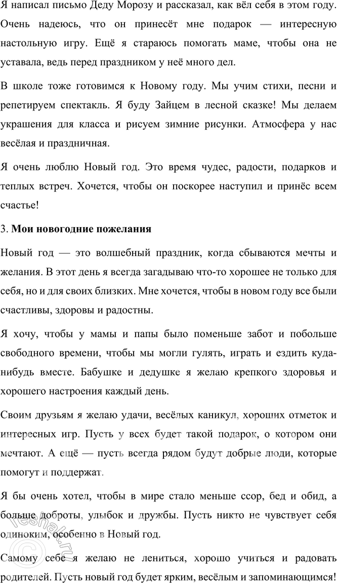 Я написал письмо Деду Морозу и рассказал, как вёл себя в этом году. Очень надеюсь, что он принесёт мне подарок — интересную настольную игру. Ещё я стараюсь помогать маме, чтобы она не уставала, ведь перед праздником у неё много дел.