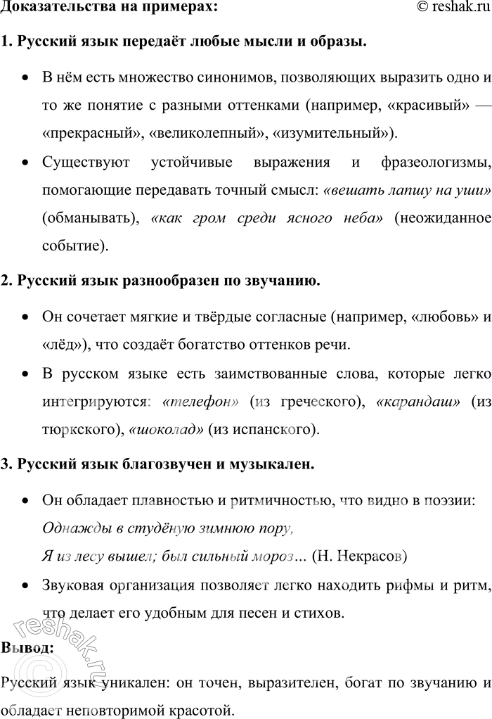 Русский язык богат, выразителен и универсален. Он способен точно передавать любые мысли и образы, обладает разнообразием звучания, включающим элементы разных языков мира, а также отличается благозвучностью и музыкальностью.