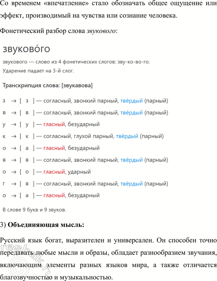 3. Особенности звукового облика (словарное слово) русского языка сообщают нашей речи общие черты благозвучности (проверочное слово – благо), музыкальности, мягкой тональности (проверочное слово – тон), высокой ритмичности (проверочное слово – ритм) — все то, что создаёт впечатление (от печать) красоты (проверочное слово – украсить) языка.