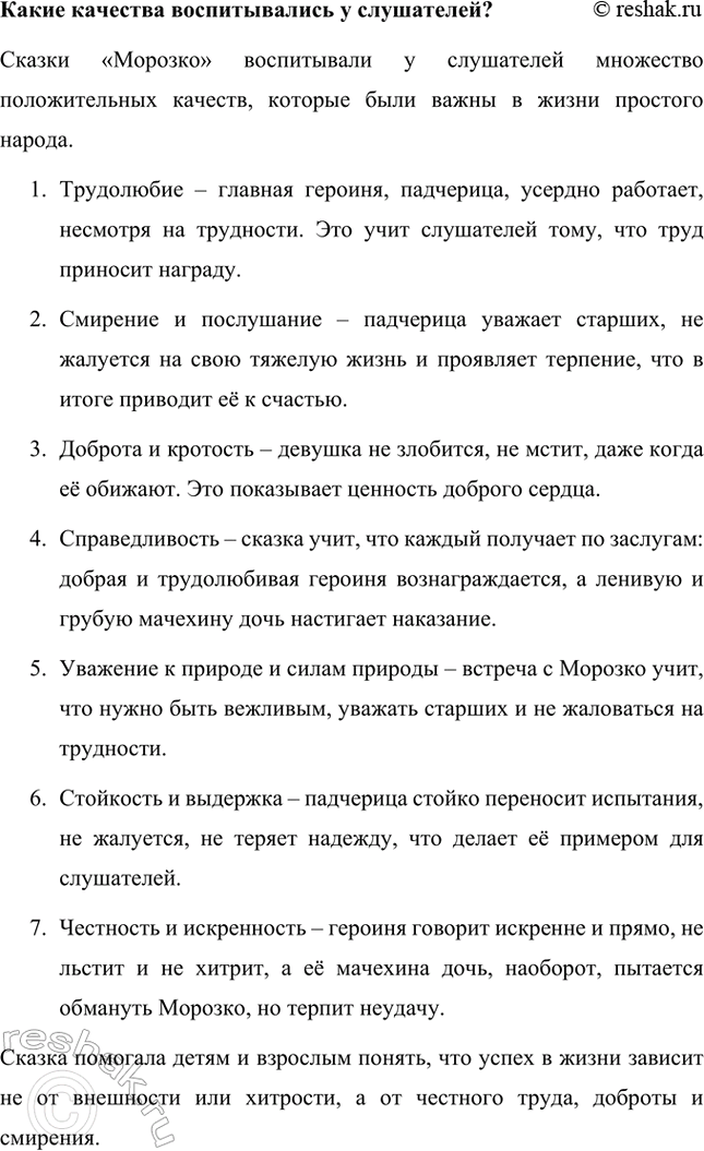 1. Трудолюбие – главная героиня, падчерица, усердно работает, несмотря на трудности. Это учит слушателей тому, что труд приносит награду.