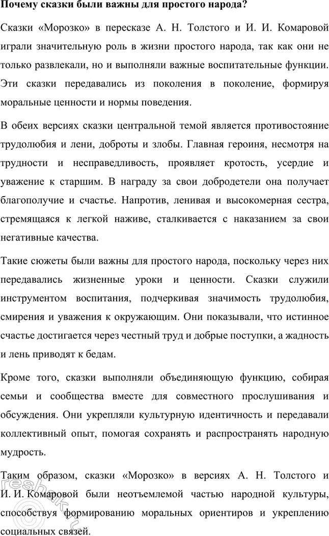 Сказки «Морозко» в пересказе А. Н. Толстого и И. И. Комаровой играли значительную роль в жизни простого народа, так как они не только развлекали, но и выполняли важные воспитательные функции. Эти сказки передавались из поколения в поколение, формируя моральные ценности и нормы поведения.