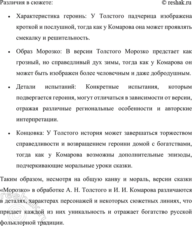 Таким образом, несмотря на общую канву и мораль, версии сказки «Морозко» в обработке А. Н. Толстого и И. И. Комарова различаются в деталях, характерах персонажей и некоторых сюжетных линиях, что придает каждой из них уникальность и отражает богатство русской фольклорной традиции.