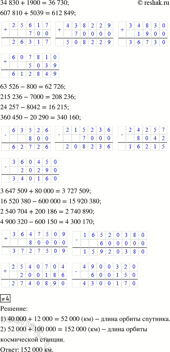 4. Длина экватора 40 000 км. Длина орбиты спутника на 12 000 км больше. А орбита космической станции на 100 000 км длиннее орбиты спутника. Вычисли длину орбиты космической станции.