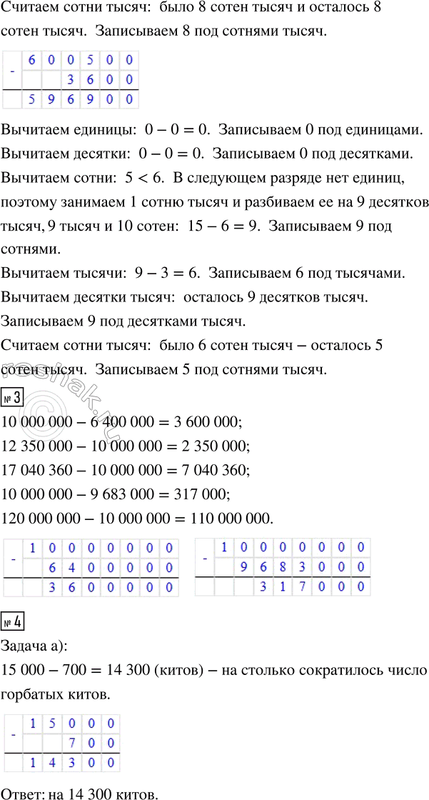 4. а) Долго горбатые киты были объектом охоты. Первоначально в Северной Атлантике было примерно 15 000 китов. Ко времени запрета китобойного промысла осталось всего 700 животных. На сколько сократилось число горбатых китов?