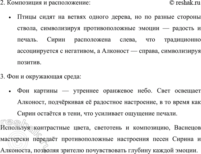 Используя контрастные цвета, светотень и композицию, Васнецов мастерски передаёт противоположные настроения песен Сирина и Алконоста, позволяя зрителю почувствовать глубину каждой эмоции.