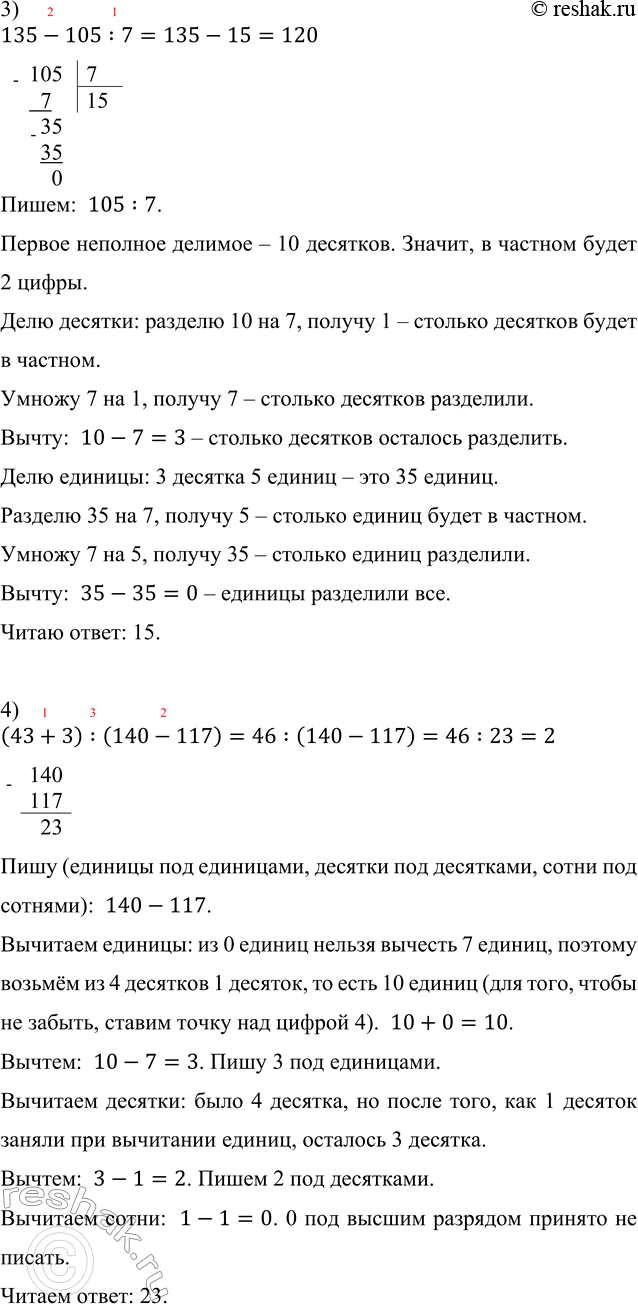 3) разность числа 135 и частного чисел 105 и 7;