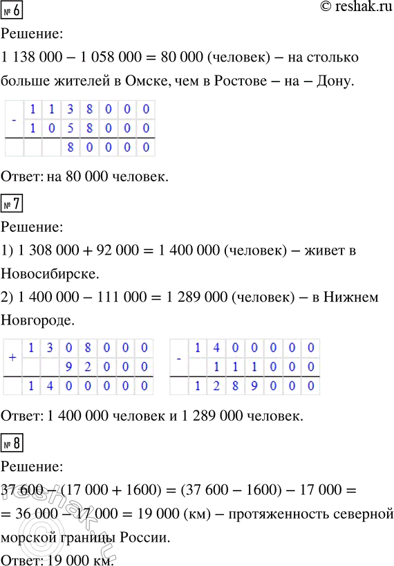 6. В Омске живёт 1 138 000 человек. В Ростове-на-Дону — 1 058 000 человек. На сколько больше жителей в Омске, чем в Ростове-на-Дону?
