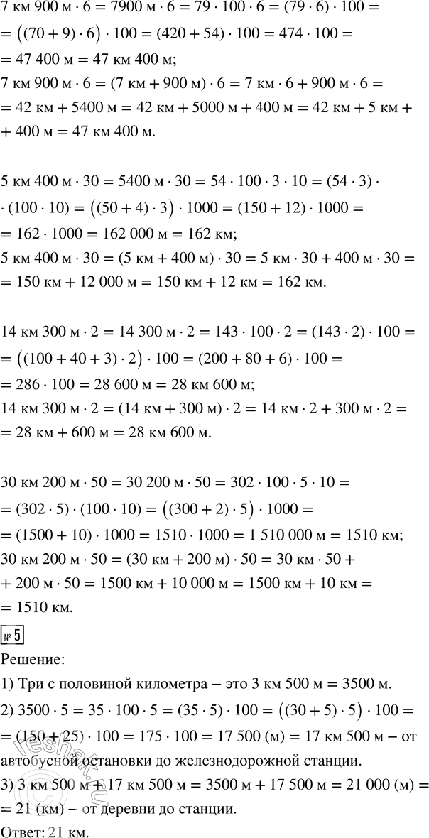 5. От деревни до автобусной остановки три с половиной километра, а от автобусной остановки до железнодорожной станции в 5 раз дальше. Сколько километров от деревни до станции?