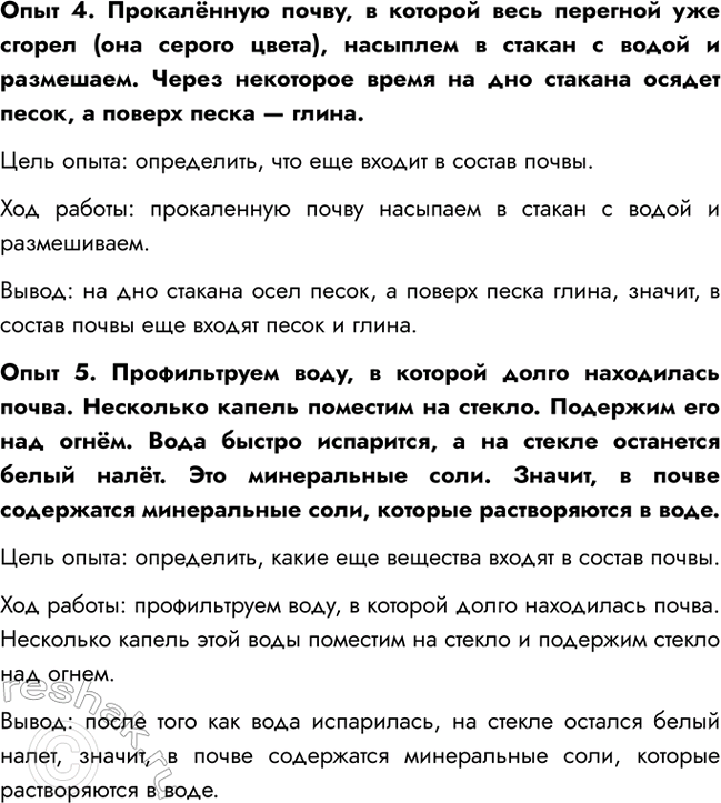 Опыт 5. Профильтруем воду, в которой долго находилась почва. Несколько капель поместим на стекло. Подержим его над огнём. Вода быстро испарится, а на стекле останется белый налёт. Это минеральные соли. Значит, в почве содержатся минеральные соли, которые растворяются в воде.