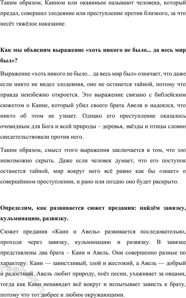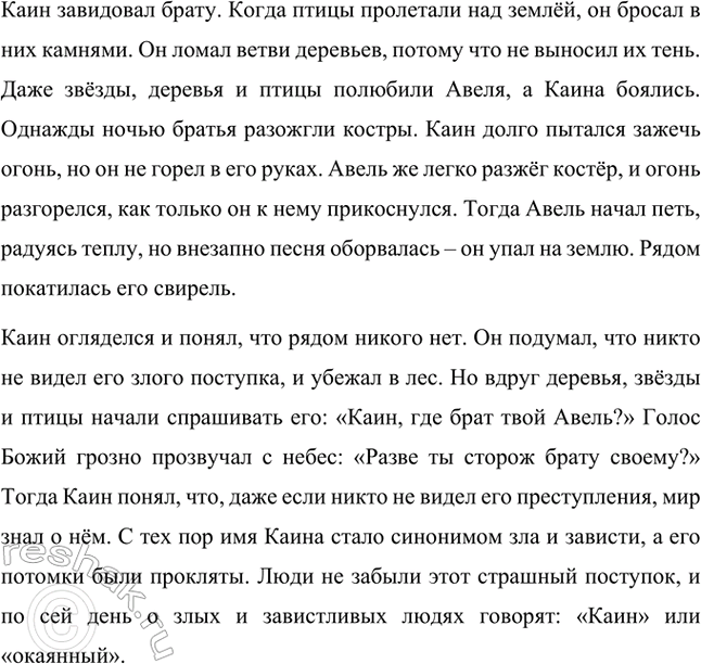 Развязка наступает, когда Каин понимает, что его преступление сделало его чужим для всех. Он становится проклятым и изгнанным, а его имя превращается в символ зла и зависти. Люди запоминают его не как человека, а как пример страшного греха. С тех пор завистливого и жестокого человека называют Каином или окаянным. Это предание подчёркивает важность доброты, справедливости и братской любви, осуждая зависть и жестокость, которые ведут к разрушению не только жизни другого, но и собственной судьбы.
