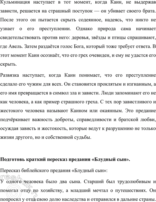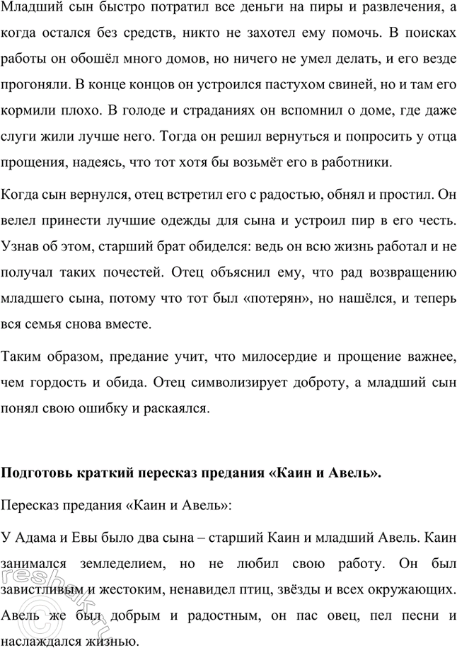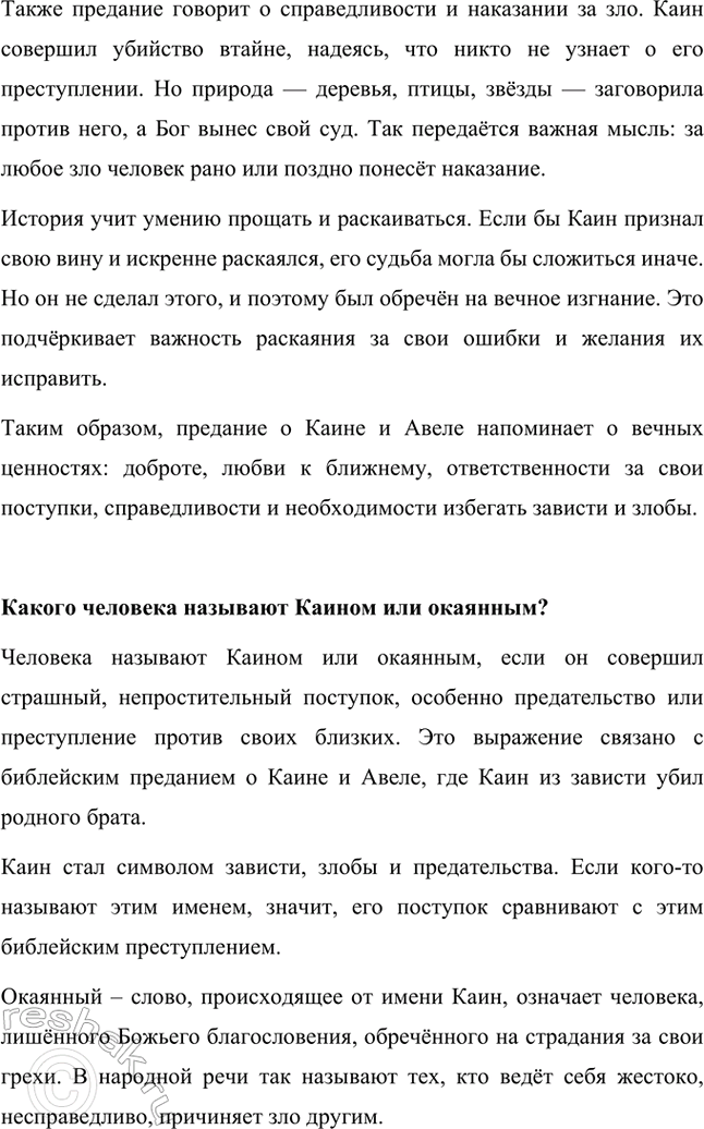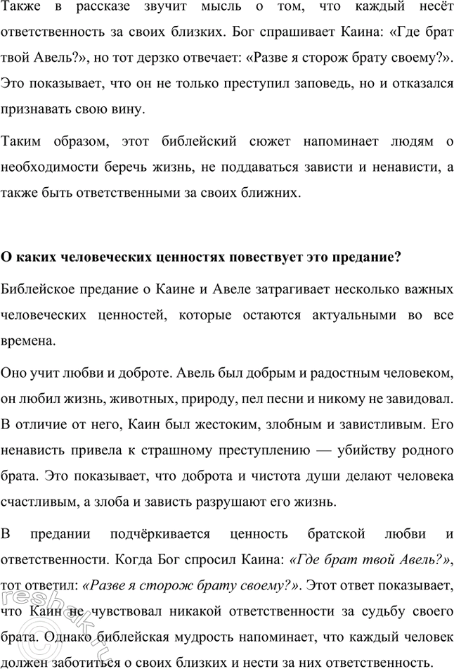 Таким образом, предание о Каине и Авеле напоминает о вечных ценностях: доброте, любви к ближнему, ответственности за свои поступки, справедливости и необходимости избегать зависти и злобы.
