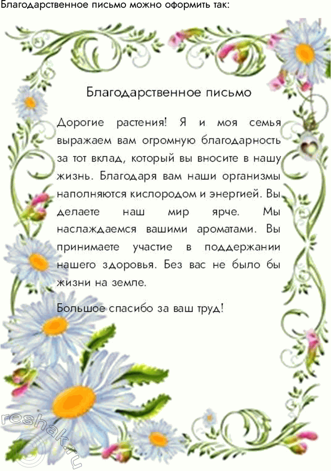 Напиши от имени своей семьи благодарственное письмо растениям за их вклад в поддержание жизни на Земле. Постарайся красиво оформить его. Приготовься торжественно зачитать письмо на уроке.